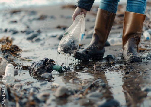 © TheosArtTavern, Obraz premium A person is picking up trash on the beach