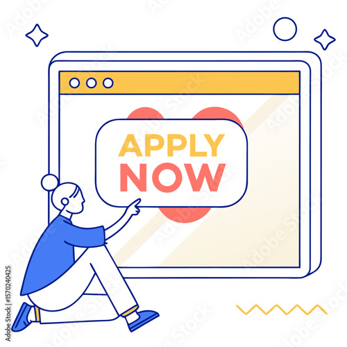 © hamza, Obraz premium A person is sitting and pointing at a computer screen with the words apply now in large letters and a bright modern design