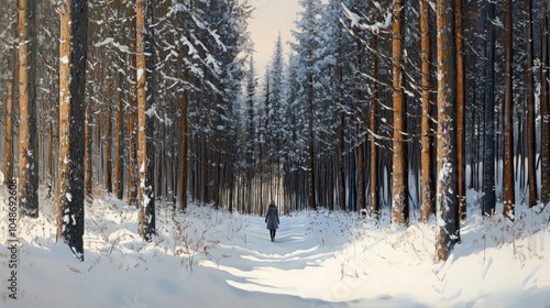 © liliyabatyrova, Fototapeta premium A person is walking through a snowy forest