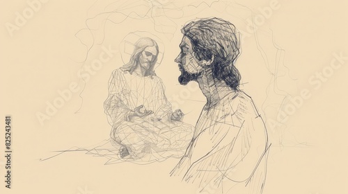 Obraz premium A Person Meditating on a Scripture Verse, with Jesus's Image Appearing in the Background, Biblical Illustration of Reflection