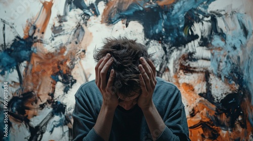 © Lakkhana, Obraz premium A person overwhelmed with stress, head in hands, surrounded by a chaotic environment