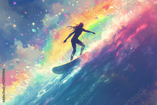 Naklejka premium a person playing surf in the rainbow sea