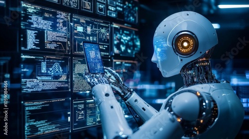 © Lakkhana, Fototapeta premium A person programming an AI system, highlighting the growing field of AI development and its impact on jobs