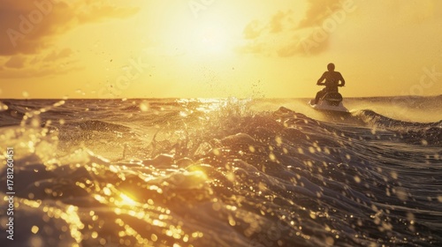 © ds17, Obraz premium A person rides a jet ski on the ocean during sunset. Waves splash around, reflecting golden sunlight. The scene captures the thrill of water sports.