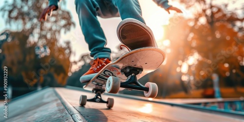 Fototapeta premium A person rides a skateboard on top of a ramp, perfect for action shots or...