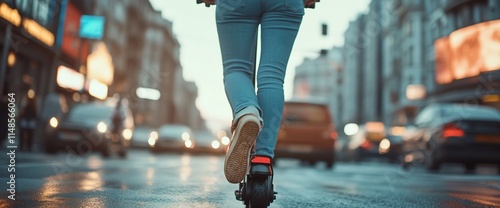 Fototapeta premium A person riding an electric scooter through a busy urban street.