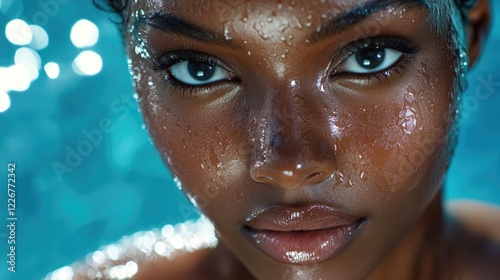 © Ева Поликарпова, Fototapeta premium A person's face is submerged underwater with waves and ripples surrounding it, suitable for use in scenes about aquatic adventures or environmental awareness