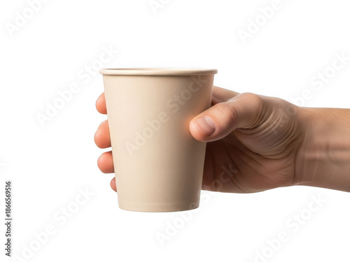 Obraz premium A person's hand holding a disposable paper coffee cup against a plain white...