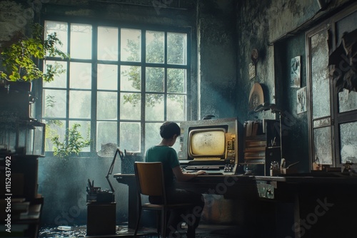 Fototapeta premium A person sitting at a desk with a TV screen in the background, possibly for...