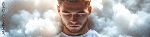 Fototapeta premium A person sitting in clouds with closed eyes, possibly meditating or...