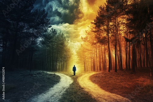 © Syahrul Zidane A, Obraz premium A person standing at a fork in a forest path, each path leading in different directions