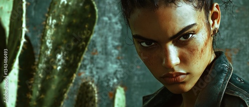 © Alena, Obraz premium A person standing close to a cactus in a desert landscape