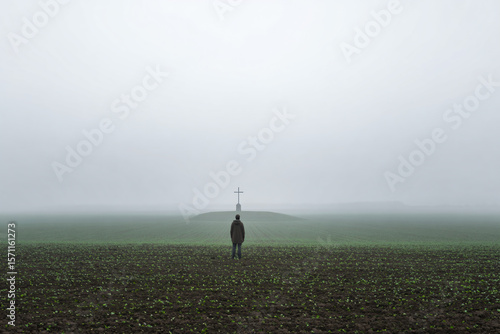 © Ninh, Fototapeta premium a person standing in a field with a cross on top of it