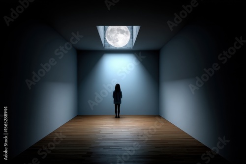 © Wall, Obraz premium A person standing in an empty room with a full moon in the background