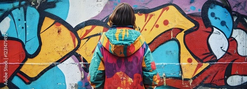 © Mr image, Fototapeta premium A person standing in front of a graffiti-covered wall, wearing a colorful jacket