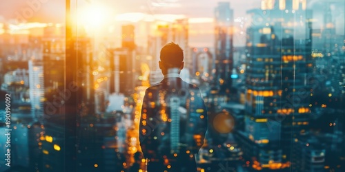 © Alexander Chaykin, Fototapeta premium A person standing in front of a window, gazing out at the city below