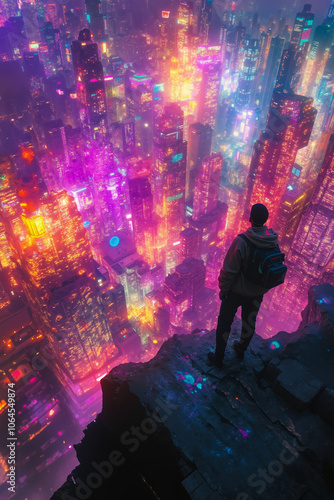 © stanhert, Fototapeta premium A person standing on a rocky outcrop overlooking a vibrant, futuristic cityscape