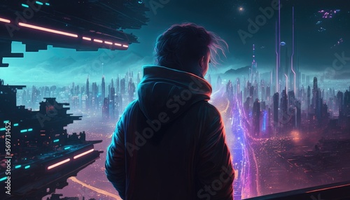 Fototapeta premium A person standing on a rooftop, looking at a foggy and futuristic cityscape with neon lights at night, AI Generative