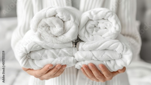 Obraz premium A person stands before a white bed, holding a stack of white towels The bed...
