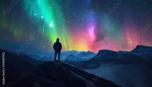 © Cindy, Fototapeta premium A person stands observing the aurora borealis in the night sky