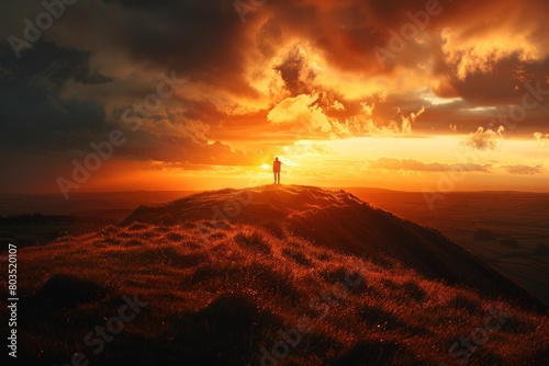 © Nico, Fototapeta premium A person stands on a hilltop, looking out at the sunset