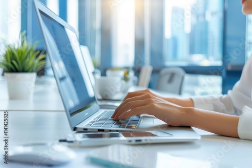 © Vilaysack, Fototapeta premium A person types on a laptop in a bright, modern office with city views and greenery, emphasizing productivity and a professional environment.