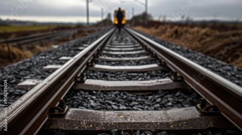 © supansa, Fototapeta premium A person walking along a railroad track with an approaching train in the distance
