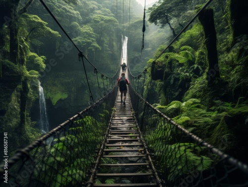 © Pual GotoMars, Obraz premium a person walking on a suspension bridge in a lush green jungle