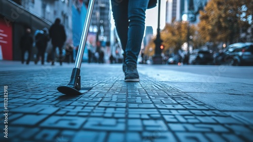 Fototapeta premium A person walking with a cane on a city sidewalk, capturing urban life and...