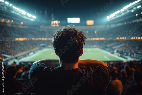© letter, Fototapeta premium A person watching a brightly lit sports stadium during an event with a large crowd, evoking anticipation and focus