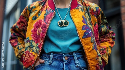 © Woranittha, Obraz premium A person wearing a bold print jacket over a simple t-shirt and jeans, illustrating how street style often features statement pieces that stand out