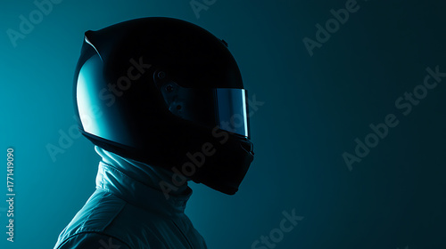 © photo for everything, Fototapeta premium A person wearing a dark helmet, possibly a racer or pilot, stands in profile against a blue background. The helmet's sleek design suggests speed and high performance.