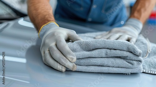 © Chonwadee, Fototapeta premium A person wearing gloves folds a clean, gray towel on a surface, indicating a focus on cleanliness and organization.