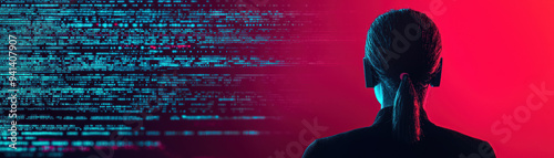 © tonstock, Obraz premium A person with ponytail facing digital data visualization on a red and blue background, representing technology, cybersecurity, and coding.