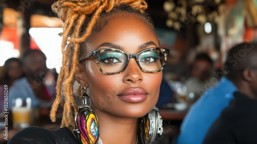 © JO BLA CO, Obraz premium A person with striking features and colorful accessories enjoys their time at a cafe packed with friends