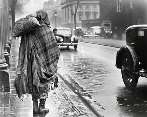 © Wikiwoki, Obraz premium A person, wrapped in blankets, walks down a wet street, carrying belongings. Vintage cars and buildings line the background, highlighting a historical period marked by hardship and survival.