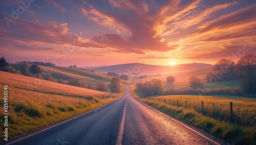 © AkuAku, Naklejka premium A perspective of an asphalt road in the countryside during a lovely spring evening.