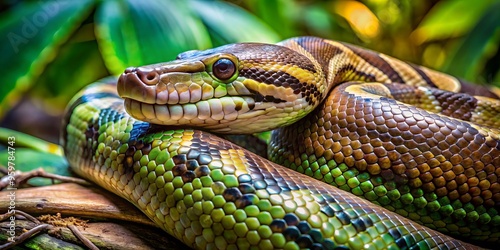 © Wanlop, Fototapeta premium "a photo image of a large, serpentine snake with a series of water-resistant, banded scales along its body, primarily green and brown tones"