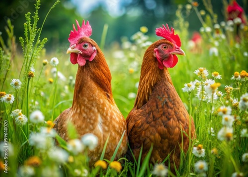 Fototapeta premium a photo image of two red hens standing in a lush green field, surrounded by tall grasses and wildflowers, with curved beaks and friendly eyes