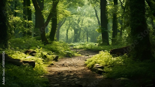 © Deira Studio, Obraz premium A photo of a forest path with lush green foliage