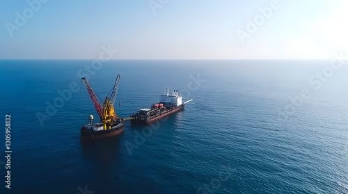 Fototapeta premium A photo of a fuel barge refueling a distant offshore oil and gas platform in the open blue sea with cranes and other visible on the platform