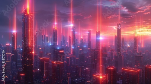 © ryker, Obraz premium A photo of a futuristic cityscape with sleek, towering mobile communication structures dominating the skyline, emitting vibrant beams of connectivity, symbolizing seamless global communication