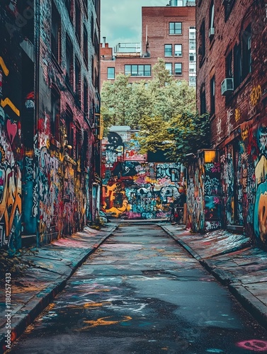 © Pascal, Fototapeta premium A photo of a graffiti-covered alleyway with colorful spray-painted walls.
