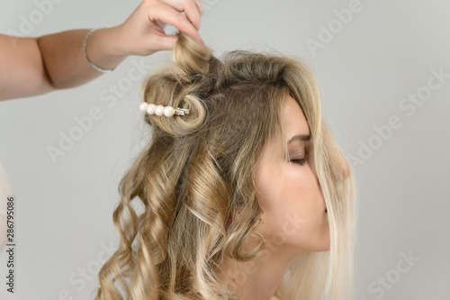 Naklejka premium A photo of a hairdresser working on a model's hair in a studio. Makes a hairstyle, styling hair on a white background.