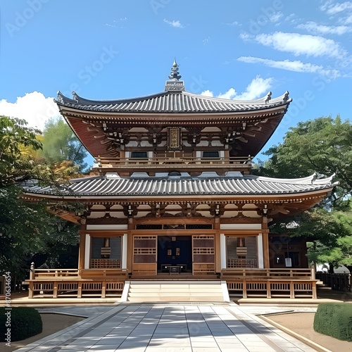 Fototapeta premium A photo of a Japanese temple with a blue sky in the background