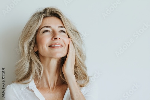 © Zaleman, Fototapeta premium A photo of a lady with blond hair and hands and chin looking at an empty space without clothes on a white background