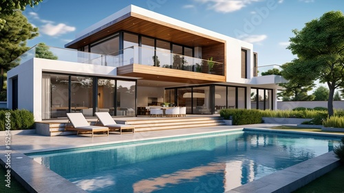 © Deira Studio, Obraz premium A photo of a modern house with a backyard pool