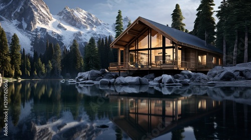 © Xfinity Stock, Fototapeta premium A photo of a Mountain Cabin Reflecting Tranquility
