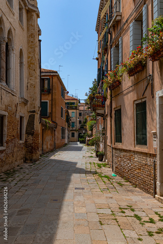 Fototapeta premium A photo of a narrow street with a stone paved path