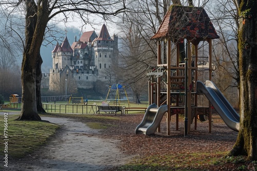 Fototapeta premium A photo of a playground featuring a castle in the background, creating a playful and whimsical setting for children, A playground under the shadow of an imposing castle, AI Generated